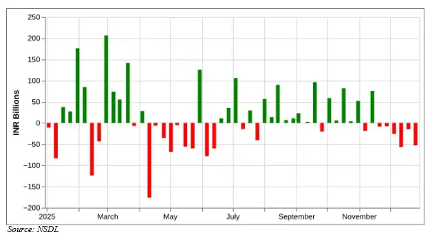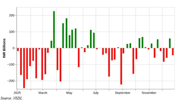 FPI flows turned sharply negative in the week ended 26 December 2025, with overall net outflows of INR 98.09 billion, reversing net inflows of INR 35.37 billion in the previous week. The outflows were largely driven by debt and secondary equity selling. Equity assets recorded net outflows of INR 43.89 billion, driven by secondary market sales of INR 49.27 billion. In contrast, primary market equity recorded modest inflows of INR 5.38 billion. Debt markets also witnessed sizable outflows of INR 52.67 billion, while hybrid instruments and mutual funds saw marginal withdrawals of INR 1.05 billion and INR 0.47 billion, respectively.