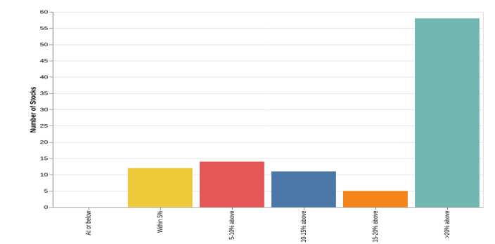 As of the end of last month, nearly 58 stocks were more than 20% away from their 52-week lows. Only 12 stocks were within 5% of their 52-week lows, with Premier Energies Ltd, ACC Ltd, and Jubilant Foodworks Ltd being the closest.