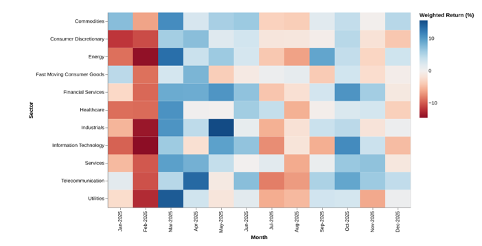 Commodities was the best-performing sector in the latest month with a weighted return of 4.72%, driven by strong performances from stocks like Hindustan Zinc Ltd, National Aluminium Company Ltd, and NMDC Ltd. On the other hand, the worst-performing sector was Information Technology, which saw a decline of 4.88%. Key contributors to this downturn included Coforge Ltd, Tata Technologies Ltd, and Oracle Financial Services Software Ltd.