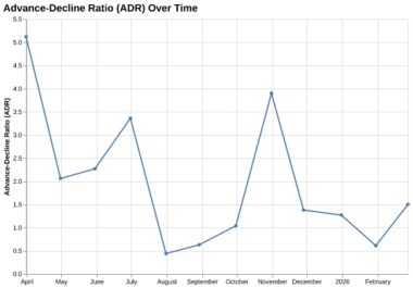 In Feb-2026, the market breadth was positive with 30 stocks advancing and 20 stocks declining. In comparison to the last month, this is better than January’s 19 advances versus 31 declines.