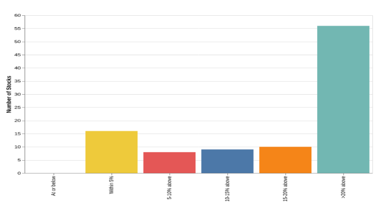 As of the end of last month, nearly 56 stocks were more than 20% above their 52-week lows. Only 16 stocks were within 5% of their 52-week lows, with Tejas Networks Ltd, Bata India Ltd, and Crompton Greaves Consumer Electricals Ltd being the closest.