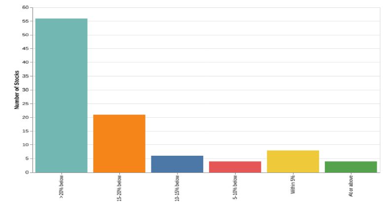 As of the end of last month, nearly 56 stocks were trading more than 20% below their 52-week highs. Only 16 stocks were within 10% of their 52-week highs, with Multi Commodity Exchange of India Ltd, Karur Vysya Bank Ltd and IIFL Finance Ltd being the closest.