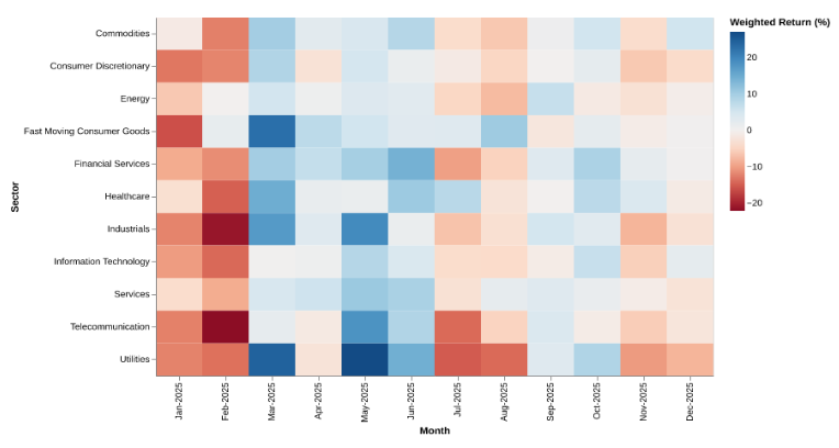 Commodities was the best-performing sector in the latest month with a weighted return of 5.5%. This was driven by strong performances from stocks like Hindustan Copper Ltd, Himadri Speciality Chemical Ltd, and Chambal Fertilisers & Chemicals Ltd. On the other hand, the worst-performing sector was Utilities, which saw a decline of 8.12%, with key contributors to this downturn including Reliance Power Ltd and CESC Ltd.